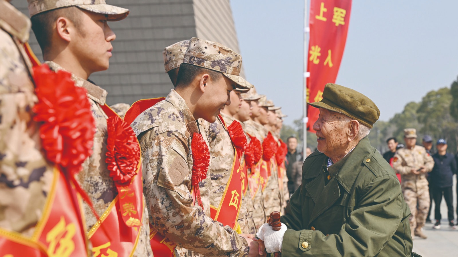 3月13日,在渡江战役纪念馆解放广场,合肥市举行2026年上半年新兵入伍欢送仪式。当日,97岁渡江战役参战老兵李胜际来到现场勉励新兵,奔赴军营建功立业。(通讯员黄星星徐伟 记者张青...
