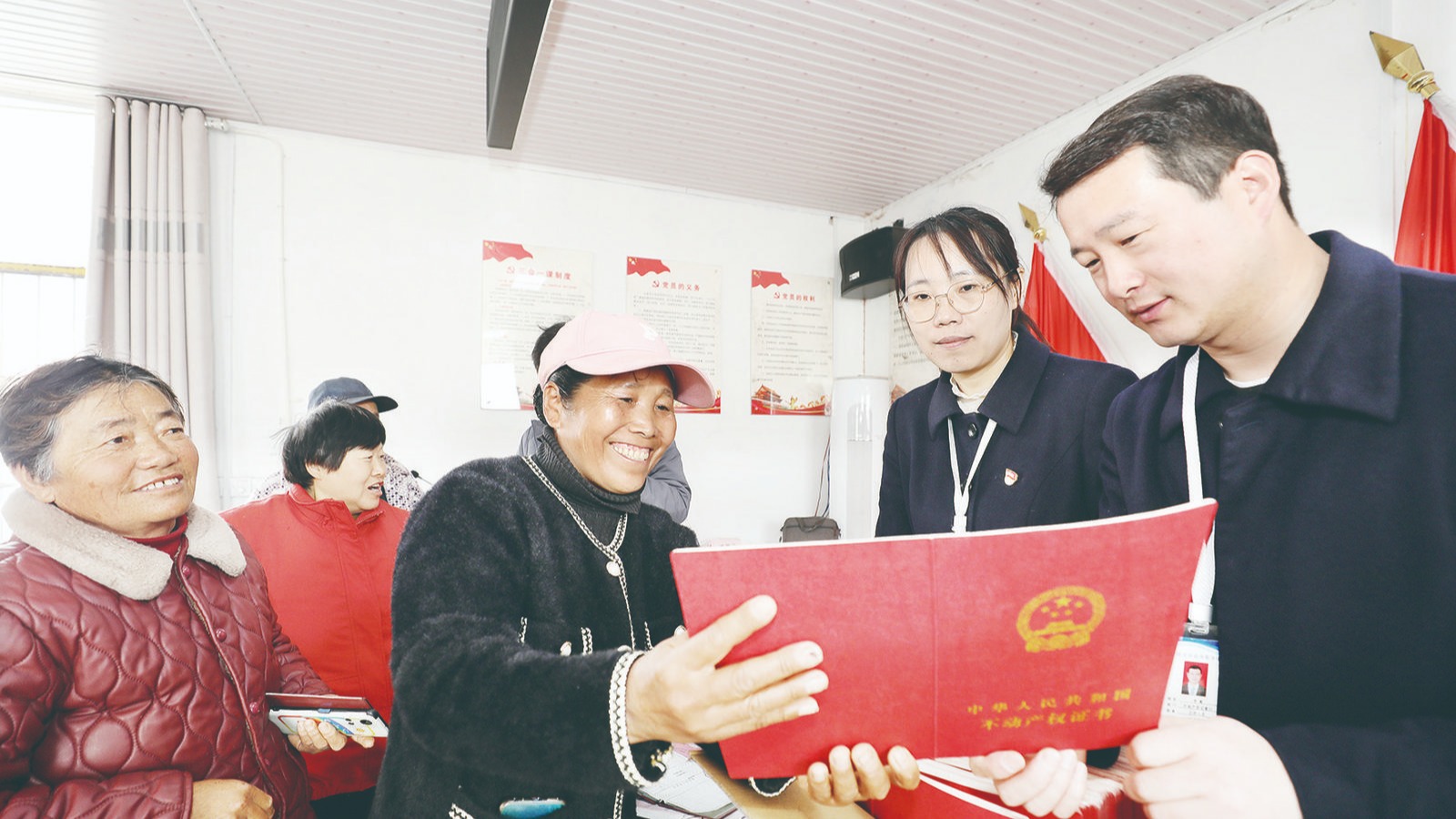 3月23日,淮北市自然资源和规划局不动产登记烈山分中心工作人员,前往烈山区烈山镇南庄村将办好的734本不动产权证书送到村民手中。
