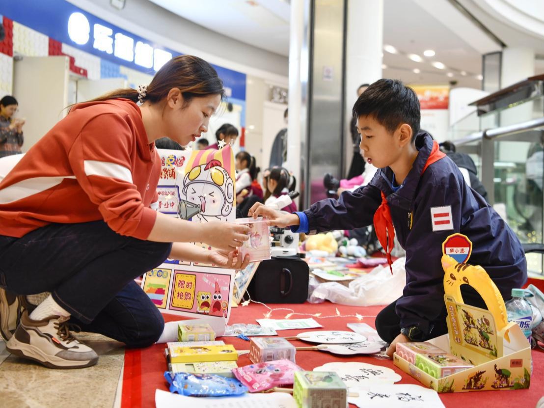 2024年10月19日,在合肥市庐阳区一家大型商场内,小学生志愿者在摊位上义卖物品。当日,合肥市庐阳区团委、亳州路街道团工委联合开展“让爱不闲置”义卖市集活动,100余名“庐小志”参与义...