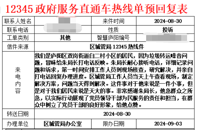 群众利益无小事,庐阳区城管局党委书记、局长朱先锋第一时间安排工作人员到现场核查情况,研究解决,并亲自致电投诉人回复办理情况。经过协调和工作人员现场勘查,该小区的垃圾转运时间从凌晨协调到晚间,困扰裴先生和小区居民的垃圾转运扰民问题当天得到解决。