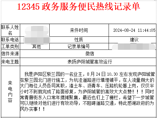 裴先生对庐阳城管的办事效率十分满意,8月30日,他又通过12345平台发来好评:“这件事对于他来说是一件小事,但是对于我们居民来说是天大的事。非常感谢朱局长,急群众之所急,以实际行动展现了党员领导干部为民服务的责任和担当,在群众中树立了党员干部的良好形象,给他点赞!”