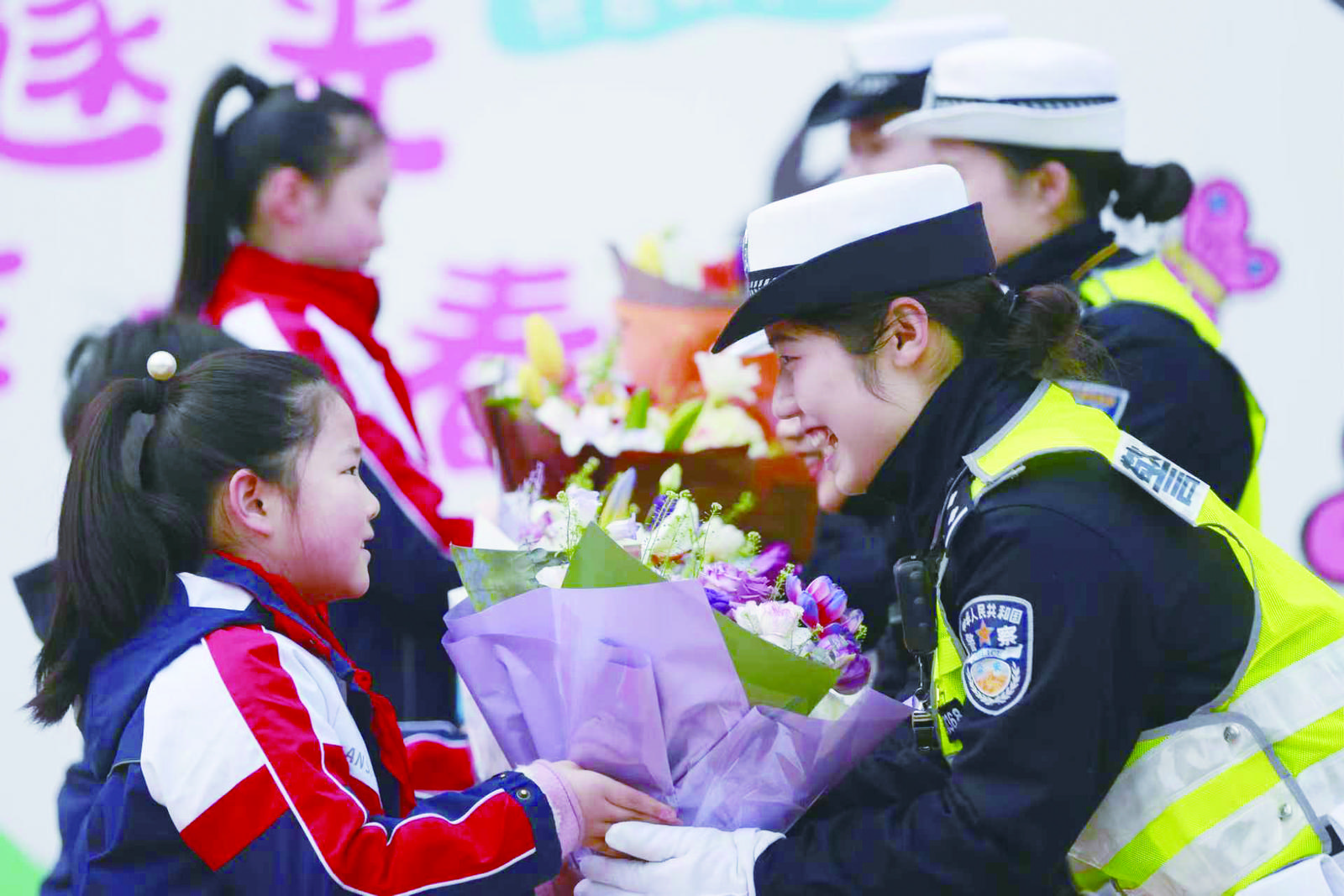 3月5日,三八妇女节来临之际,芜湖市公安局交管支队弋江大队女子护学岗民警辅警,一如既往坚守在安徽师范大学附属小学(西校区)门前,疏导交通、守护师生安全。当日8时许,学生们在学校组织下,向女警们送上鲜花、敬队礼,致谢她们近10年的默默守护。(通讯员 陈效宝 记者 李斐 摄)