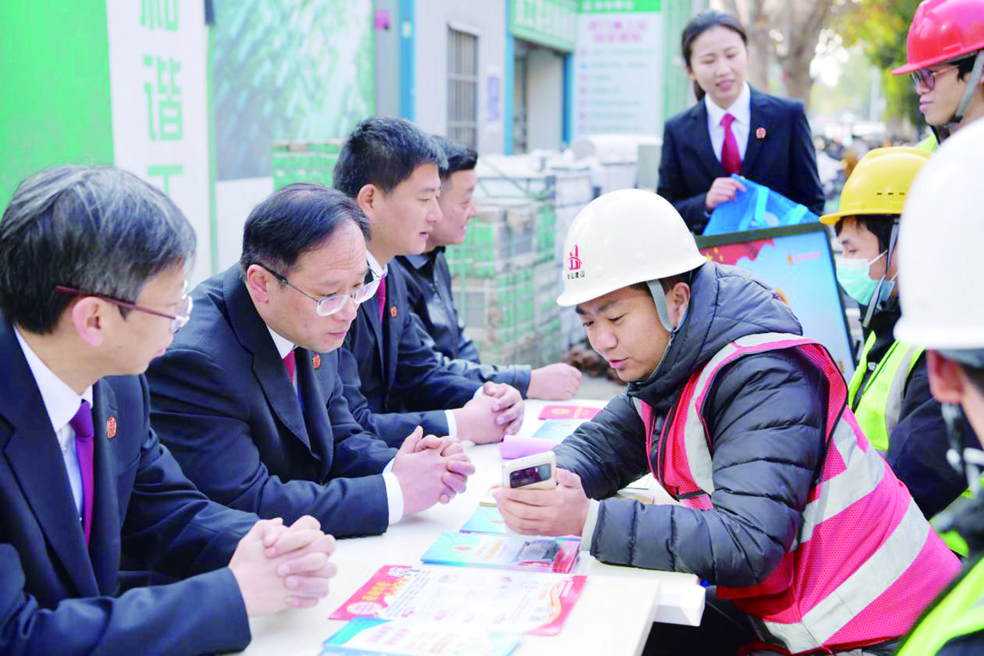 近日,合肥铁路运输法院联合合肥市常青街道淝南社区开展普法活动,将一堂生动而实用的法律课“搬”进了辖区内的建筑工地。法官们还结合工友们最关心的工资支付、劳动合同、工伤维权等实际问题,深入浅出地进行了解读。(通讯员 赵媛媛 记者 吴文珍 摄)