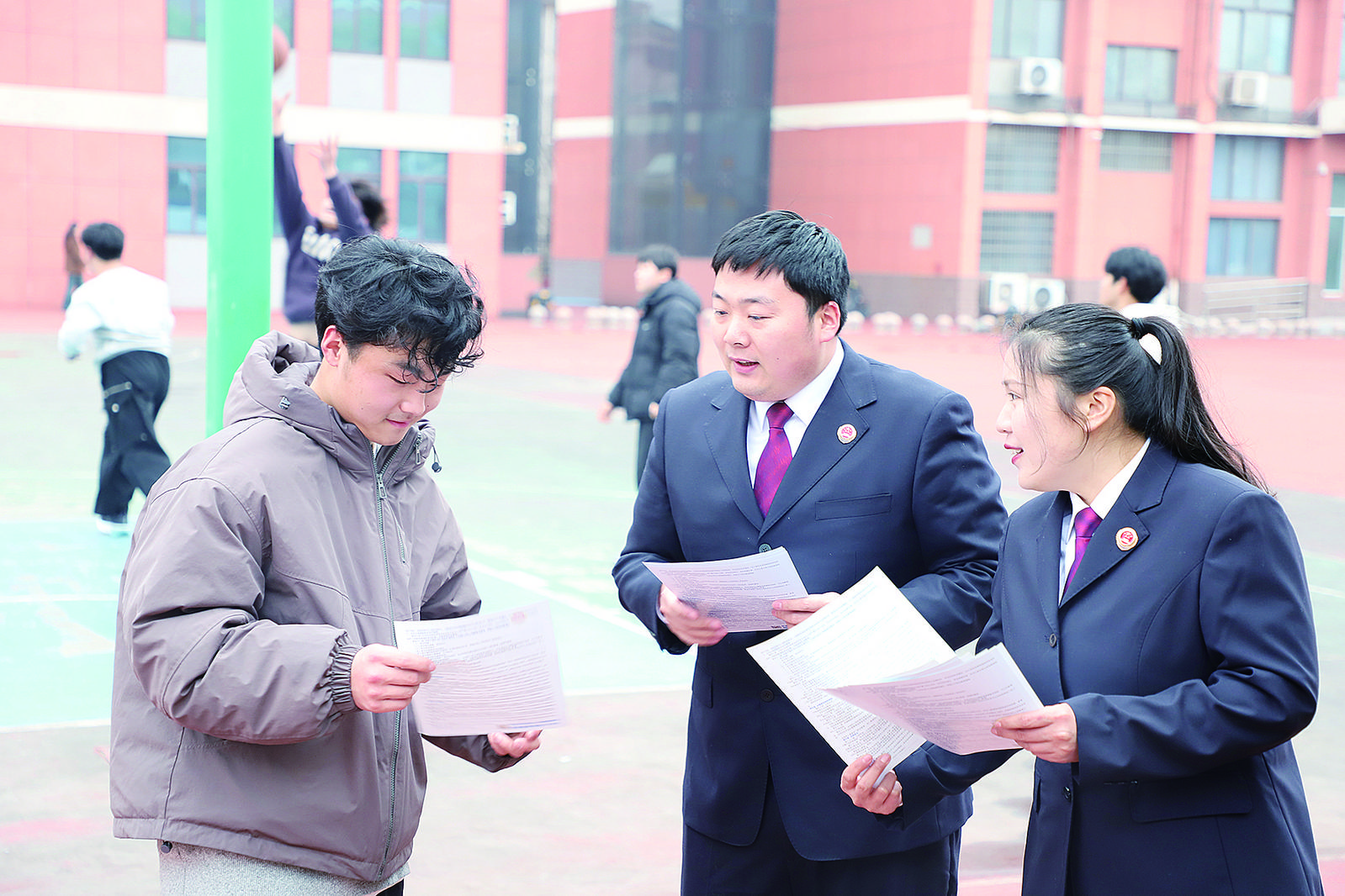 3月18日,阜阳市颍州区人民检察院未检团队干警们走进学生中间开展普法宣传,向学生们发放宣传手册。当天,该院党组书记、检察长王茹以法治副校长身份带领“州舟护航”未检团队走进阜阳科学技术学校,通过座谈问需和精准普法,推动检校共建走深走实,以检察力量护航职教学子平安成长。(通讯员 冷曙艳 周靖宇 摄)
