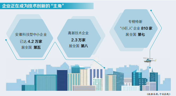 据统计,安徽科技型中小企业已达4.2万家、居全国第五,高新技术企业2.3万家、居全国第八,专精特新“小巨人”企业810家、居全国第七——企业正在成为技术创新的“主角”。